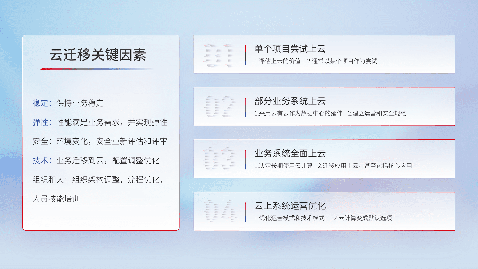 结合实际业务,,,,从规划设计、、、云平台选型、、、云原生改造、、、数据迁移、、、、集成交付,,,迁移全过程为客户识别最佳上云路径,,,,做好风险识别管理,,设计网络架构、、、、身份权限、、安全审计合规、、操作审计、、、、日志审计、、监控告警策略、、、多站点容灾设计等,,对云上基础设施进行整体规划,,,提升IT治理水平,,以满足弹性、、、、高可用、、高性能的需求。。