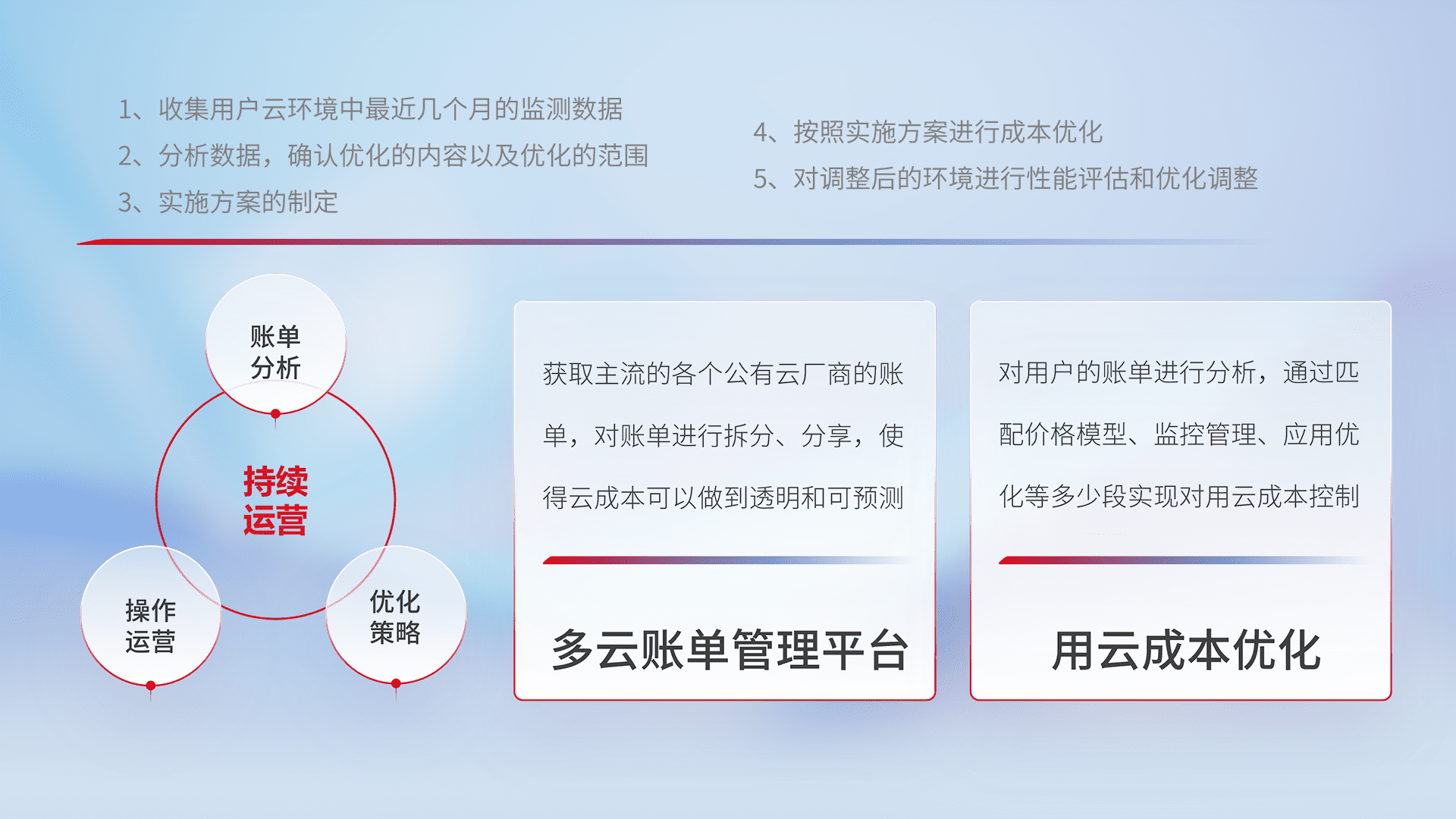 通过多云纳管,,,以统一的资源数据模型把客户的云资源进行抽象和封装,,,进而实现对多云资源的统一操作,,保障云资源管理的可靠性、、、稳定性与可用性。。。量身定制化运维内容,,,配置、、、开发运维、、、补丁管理、、、、备份、、监控、、、认证和访问管理、、、审计和日常巡检等,,,保障在用云过程中的可靠度,,稳定度以及高可用率。。。