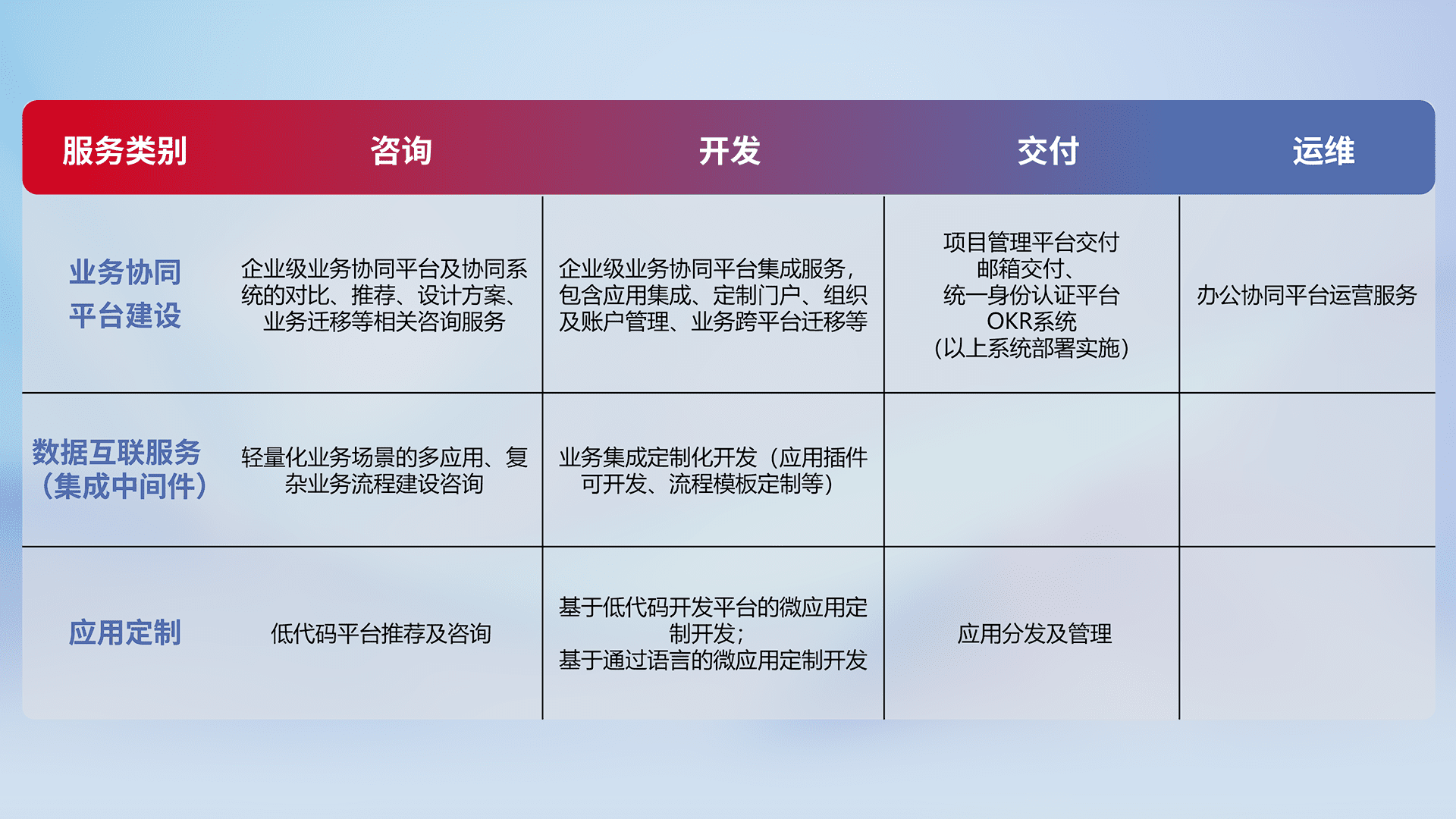 针对钉钉、、、企微、、IDaas等平台级产品提供产品的规划、、方案、、交付、、、定制化开发等服务,,,,实现如统一协同办公、、、、智能客户服务、、混合会议管理、、、智能数据查询、、等业务场景,,,实现数字化转型。。。。